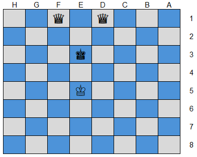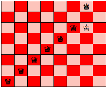 The same scenario applies to the G1 queen moving to G7, and all the other following moves, of the queens, until the position below is reached, and there are no more safe squares, as the king comes into play, leaving the safe square with nowhere to move to. This then leads to the total board domination position, as seen below.