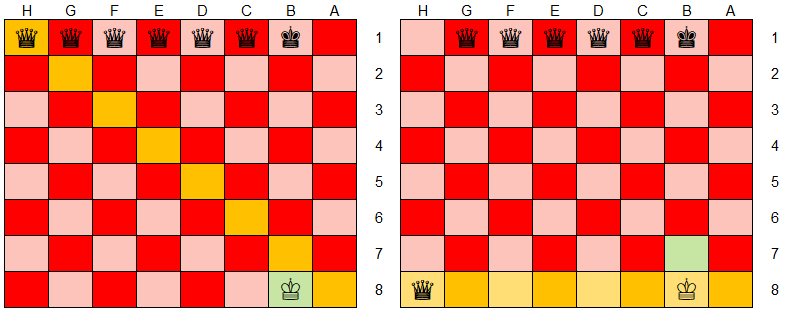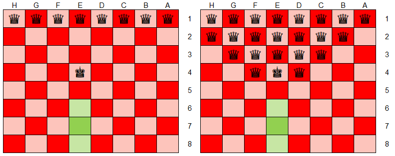 Now, if we go back to the 6 queen game, and apply these principles to the board, then we can start to understand how the safe zone for the white king can be formed.